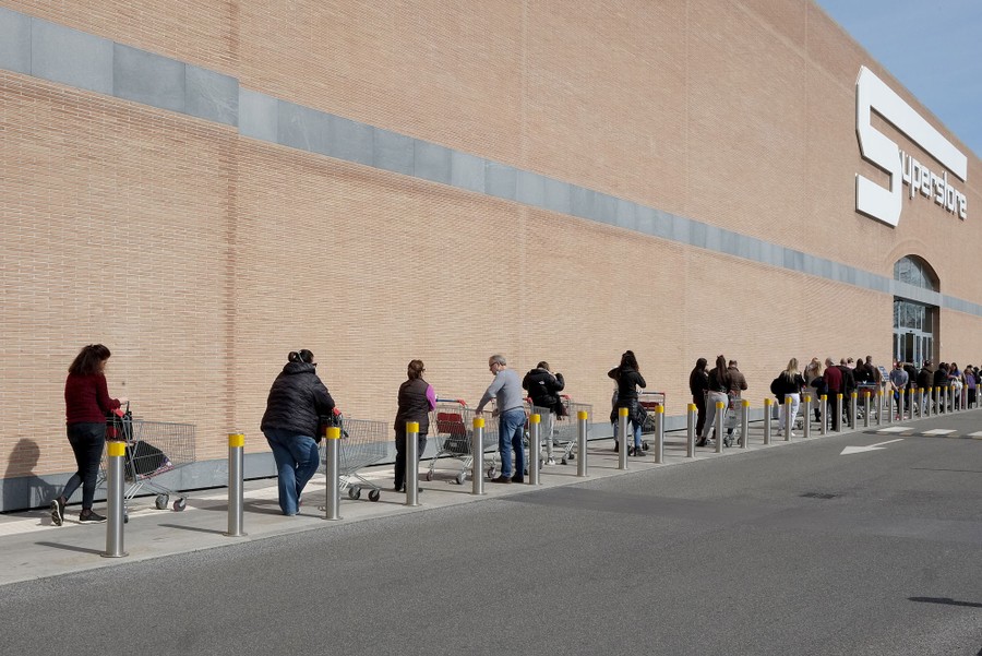 Read morePeople with face masks line up at a supermarket to stock up on food and goods, after a government announcement prohibiting travel and assembly, on March 10, 2020, in Rome, Italy. #