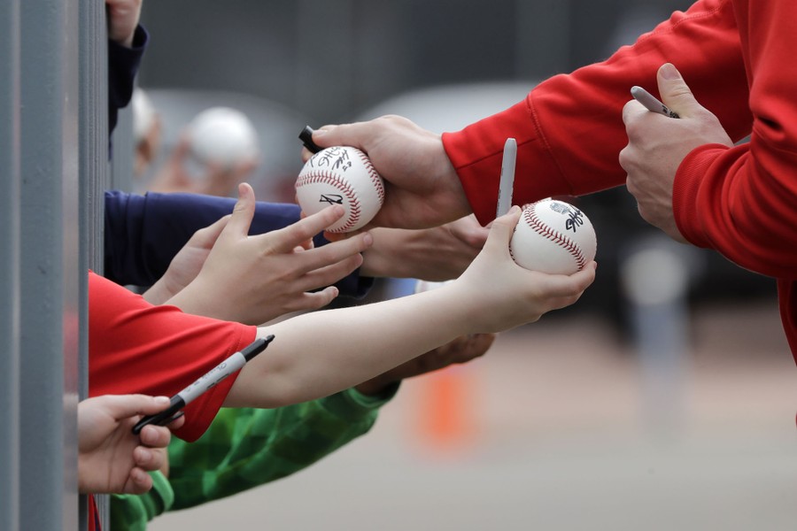 Read moreA Los Angeles Angels player reaches for a baseball to autograph for a child standing behind a fence, before the team’s spring-training baseball game against the Seattle Mariners, on March 10, 2020, in Peoria, Arizona. #