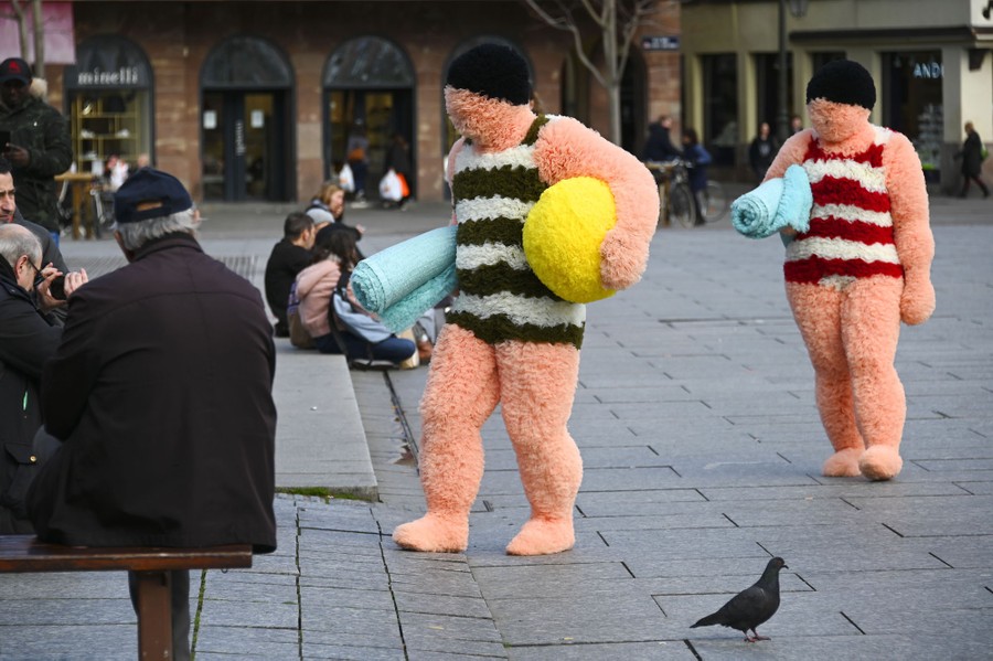 Read moreFrench artists Coco Petitpierre and Yvan Clédat, equipped with a beach ball and towels, arrive for a creative performance entitled “Les Baigneurs” in Strasbourg, France, on March 11, 2020, as part of the Les Giboulées festival. #