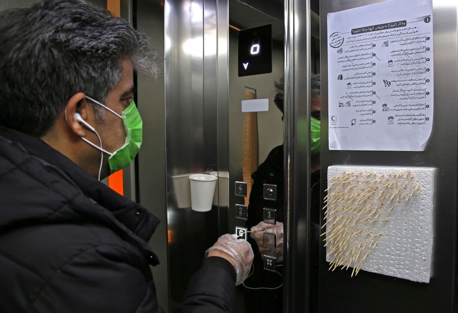 Read moreAn Iranian man uses a provided toothpick to press an elevator button in an office building in Tehran on March 4, 2020, as a preventative measure against viral transmission. #