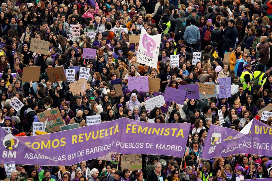 Read moreDemonstrators hold placards and a banner that reads “We are the feminist revolution” during a protest to mark International Women’s Day in Madrid, Spain, on March 8, 2020. #