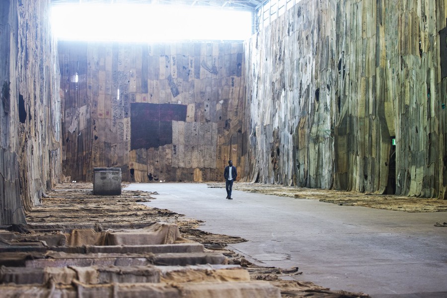 Read moreGhanaian artist Ibrahim Mahama is seen with his large-scale installation in the Turbine Hall on Cockatoo Island during the 22nd Biennale of Sydney NIRIN media preview on March 10, 2020, in Sydney, Australia. The installation of sewn coal sacks that covers the interior of the building speaks to his investigation of the conditions of supply and demand in African markets. #