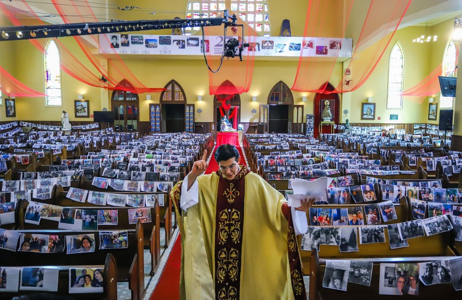 Read morePriest Reginaldo Manzotti of the Nossa Senhora de Guadalupe sanctuary streams his Easter Sunday service with printed photos of his congregation in the pews as his parishioners self-isolate during the coronavirus pandemic in Curitiba, Brazil, on April 12, 2020. The celebration was broadcast to the parishioners online. #