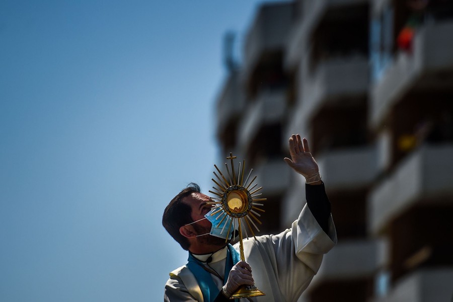 Read moreFather Nuno Westwood prays for the faithful staying home on Easter Sunday due to the coronavirus outbreak in Oeiras, on the outskirts of Lisbon, Portugal, on April 12, 2020. Standing in a small white convertible, Father Westwood traveled through the streets of his parishes praying in a microphone to be heard by the community members at their windows. #