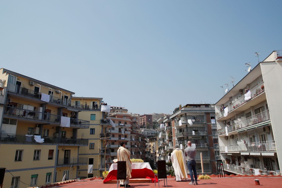 Read morePriests Lorenzo Fedele and Francesco Gravina lead an Easter Sunday Mass from the roof of the Santa Maria della Salute church for locals who participated from their balconies and windows, as Italy remains on lockdown, in Naples, Italy, on April 12, 2020. #