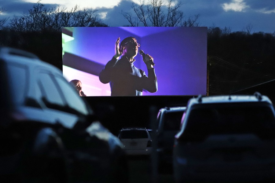 Read moreJonathan Lazzaro of the Harvest Baptist Church worship team, from Harrison, Pennsylvania, appears during the first screening of an Easter service at Riverside Drive In Theatre in Vandergrift, Pennsylvania, at sunset on April 10, 2020. #
