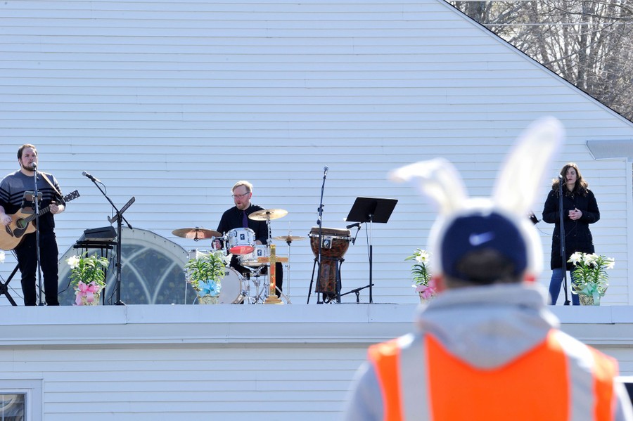 Read moreVolunteer Al Wheeler, wearing bunny ears, keeps an eye on the service and cars during a drive-in Easter service at the First Baptist Church in Plaistow, New Hampshire, on April 12, 2020. #