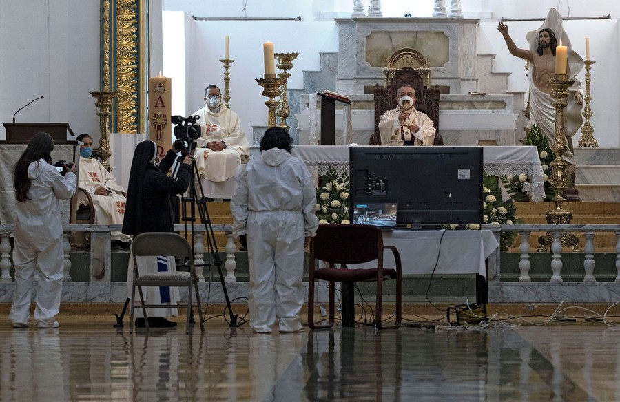 Read moreTechnicians wearing protective suits stand next to a nun who records as Mexican Archbishop Francisco Moreno Barrón celebrates Easter Mass in an empty cathedral in Tijuana, Baja California state, Mexico, on April 12, 2020. #