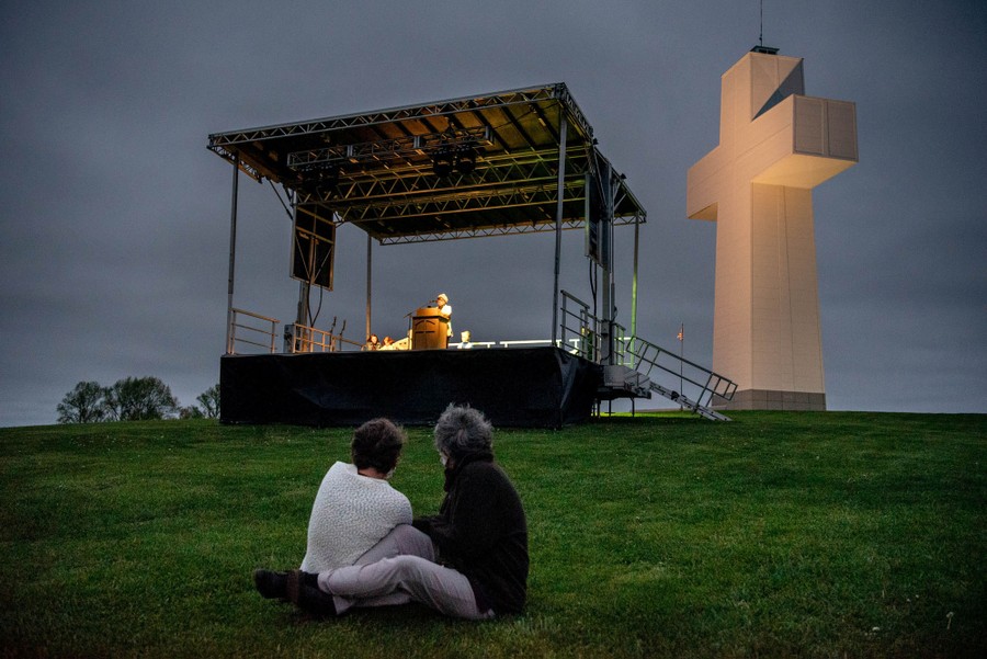 Read moreVictoria Bittle and her grandmother Alice Stearns watch a sunrise Easter service, one that typically sees thousands of people annually but was closed to the public this year and moved to a television broadcast, in Alto Pass, Illinois, on April 12, 2020. #