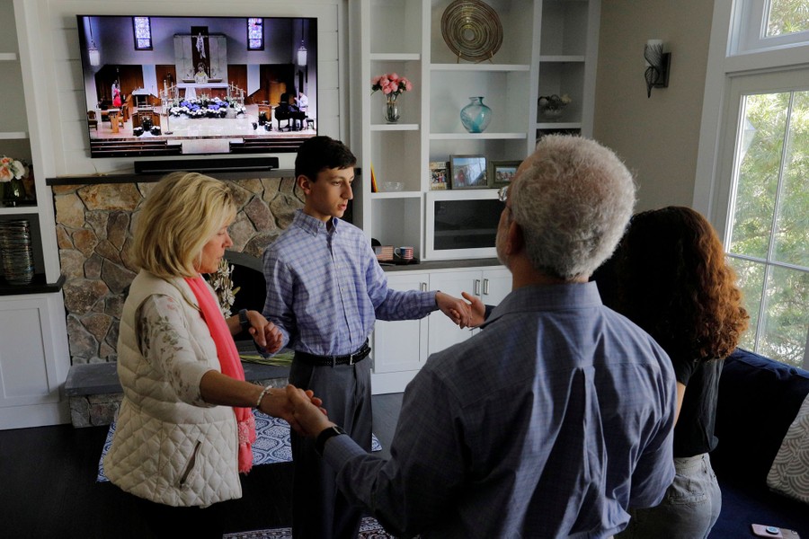 Read morePeter Lando and his family take part in Easter Mass live-streamed on the television in their home from St. Mary’s Catholic Church amid the coronavirus outbreak in Carlisle, Massachusetts, on April 12, 2020. #