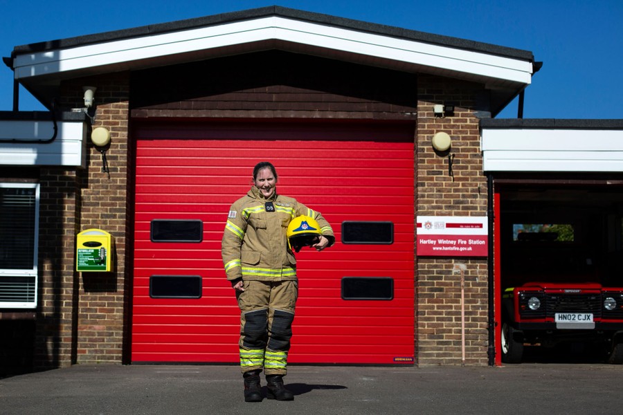 Read morePenny Ewbank, an on-call firefighter for Hampshire Fire and Rescue Service, poses outside the fire station in Hartley Wintney, England, on April 22, 2020. Ewbank said she is trained to do a particular job and if she can use those skills to help others, she won't hesitate. She believes that her job is both a duty and a sacrifice. #