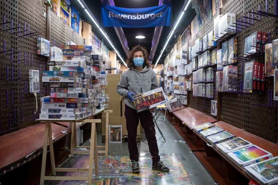 Read moreCaroline Belles, head of Puzzle Mania, poses in her shop in Barcelona, Spain, on April 22, 2020. Belles works with two other people, so they use gloves and masks and stay a proper distance from one another while working behind closed doors. She does not feel that she is taking any risks, because she lives alone. She travels on her bicycle and follows safety protocols with colleagues. For her, it is neither a sacrifice nor a duty, but a pleasure to be able to offer anyone who enjoys puzzles a hobby, and especially a moment of mental relaxation. She says it is something she feels each time she receives a message of support and gratitude for the work they do. #