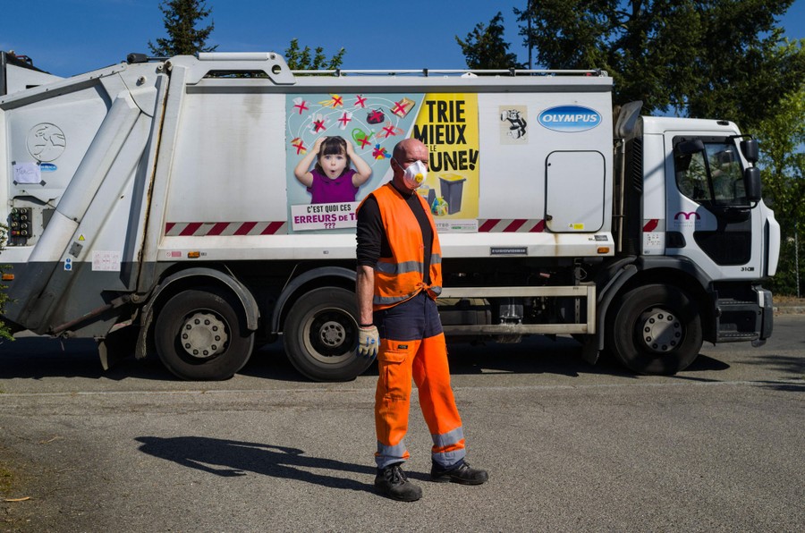Read moreThierry Pauly, a garbage collector, stands beside a garbage truck in Mulhouse, France, on April 24, 2020. Pauly's shift ends earlier than normal, to avoid groups of people at the depot. His safety measures against COVID-19 include masks and existing standard equipment. Pauly does his work, which he chose 18 years ago, with a professional attitude, and for him it remains a duty. #