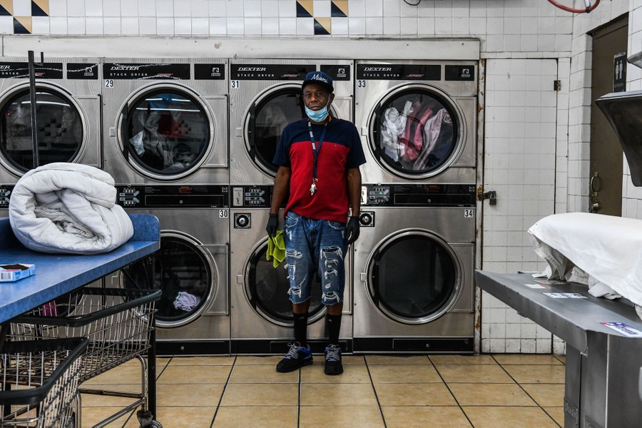 Read moreGregory Stark, a laundry-shop employee, poses in Miami on April 17, 2020. Stark feels blessed for having a job and feels obligated to work, because not everybody has a washing machine at home. He wears a face mask and gloves all day to keep him protected as he helps customers bring their laundry in from their cars and sort it. #