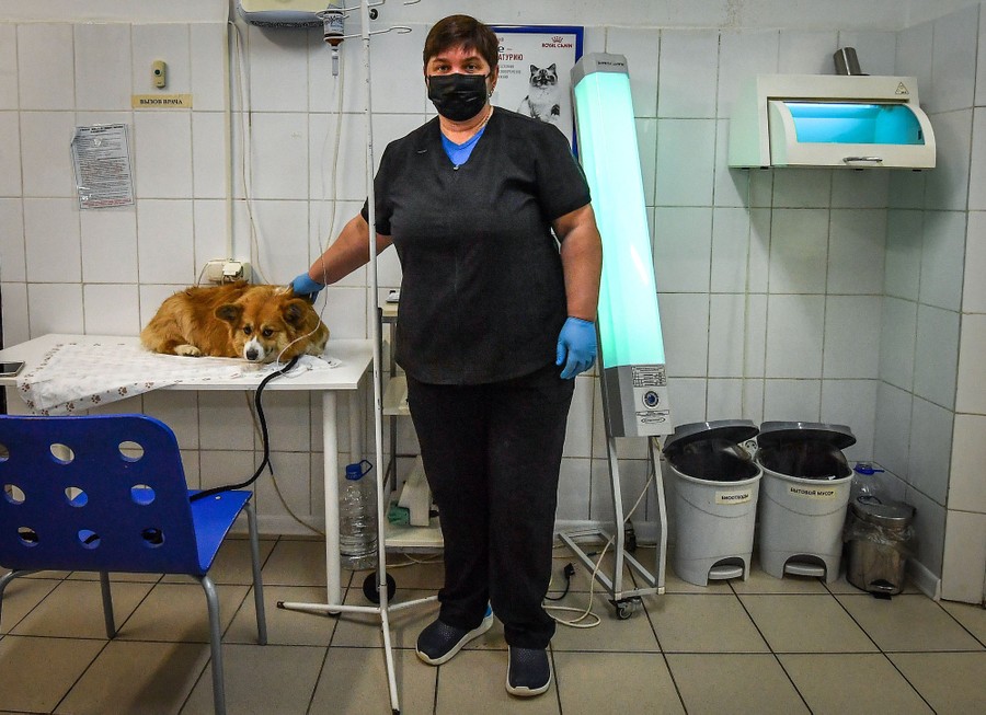 Read moreOlga Sokolova, a veterinary surgeon, poses next to her dog patient at the ZooAcademy veterinary clinic in Moscow on April 21, 2020, during a strict lockdown to stop the spread of the coronavirus. Sokolova said veterinarians can't stop or suspend their activity, because pets are like children. #
