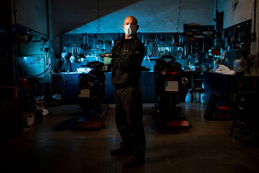 Read moreDomingo Reina, a motorcycle mechanic, stands in his workshop in Barcelona, Spain, on April 22, 2020. Reina does not feel that he is taking any risks while working during the pandemic, because he wears a face mask and gloves and works alone, behind closed doors. He thinks working is not a sacrifice or a duty, but a necessity. He is happy to have helped some of the neighborhood doctors who had problems with their motorcycles in recent weeks. #