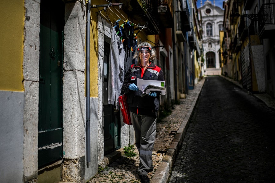 Read moreCarla Marina Figueiredo, a postal worker, wears a face shield in Lisbon, Portugal, on April 21, 2020. For Figueiredo, working during the coronavirus outbreak is not a risk because, aside from working outside, she thinks she has the right gear and takes the necessary precautions. For her, being a postal worker is a duty because a lot of people depend on the mail to get their allowance to pay their bills. #