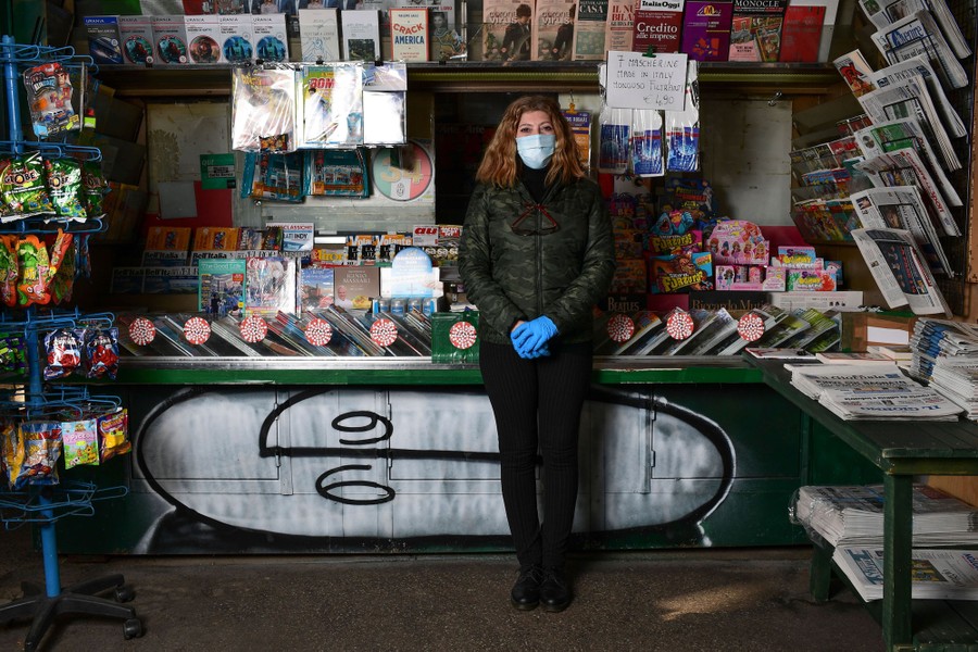 Read moreRosy Varrella, a newspaper-kiosk owner, in Milan on April 23, 2020. Varrella considers her work a public utility because it provides information to customers. Because many elderly people no longer leave their home, the kiosk now makes deliveries, which she feels is a duty. She has worries, but takes precautions and maintains safe distances. #