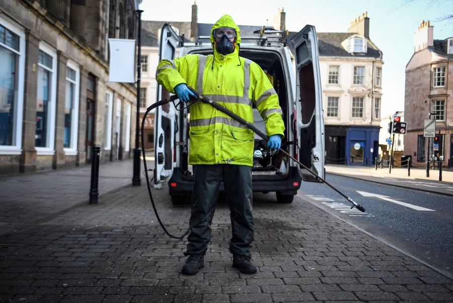 Read moreRobin Barclay, a cleaning contractor, poses on a street in Glasgow, Scotland, on April 18, 2020. Barclay feels that by sanitizing areas with high human interaction, he can help slow the spread of the new coronavirus, raise the spirits of his community, and save lives. He considers it his duty to help in this instance. As one of the directors of a company that offers professional sanitizing and stocks the chemicals required, he feels it is a natural step to offer sanitizing services for free to vulnerable areas and people. He said that ultimately, if he can prevent just one person from contracting the virus, it will all be worth it. #