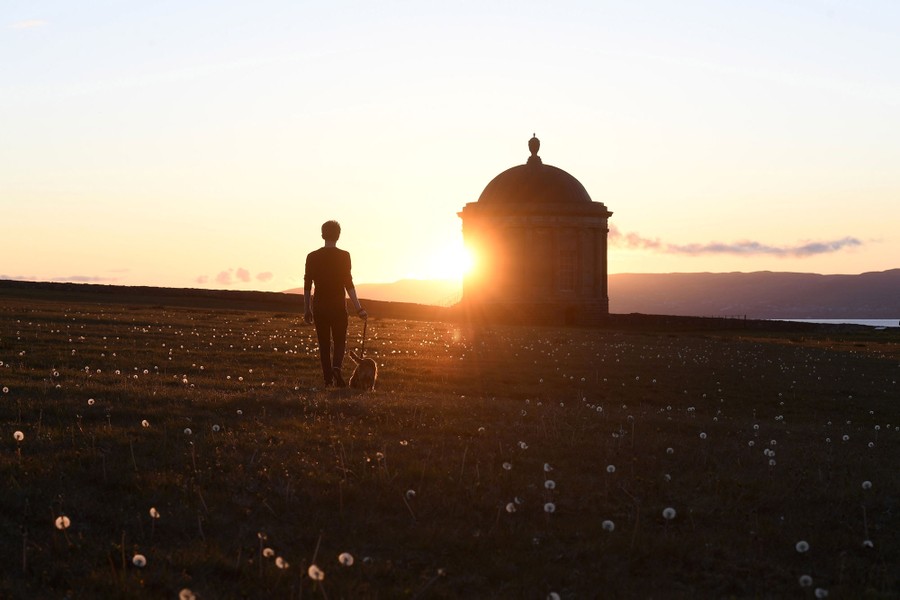Read moreA man walks his dog at sunset beside a deserted Mussenden Temple, built in 1785 by the Earl Bishop, above Downhill Beach in Downhill, Northern Ireland, on April 27, 2020. #
