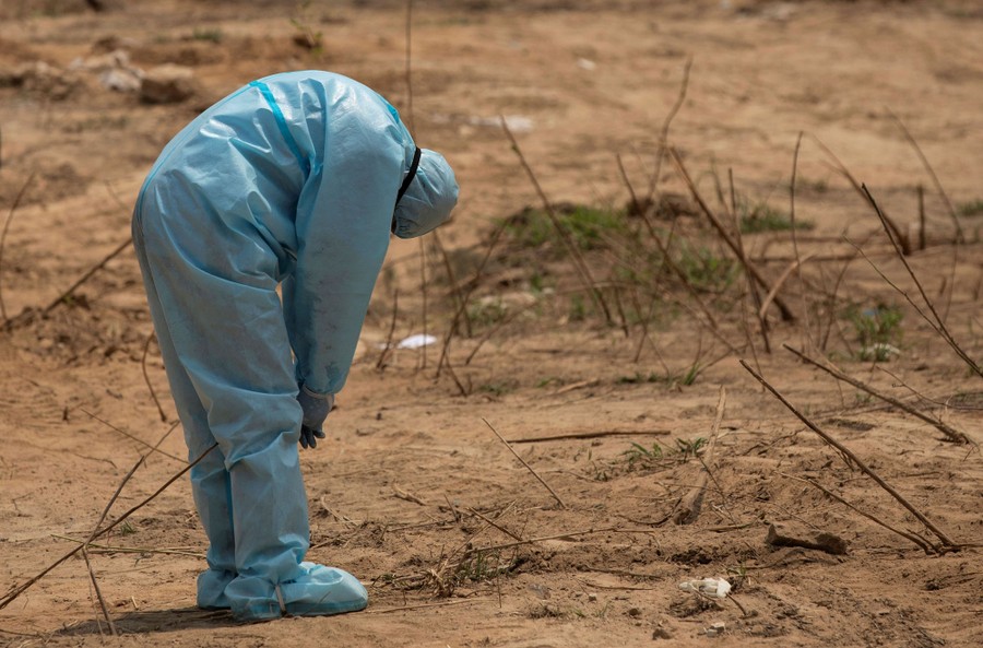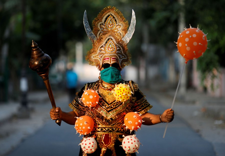 Read moreA local resident dressed as Yamraj, the Hindu god of death, wearing a coronavirus-themed balloon necklace, poses during an awareness event about social distancing and staying at home, in New Delhi, India, on April 28, 2020. #