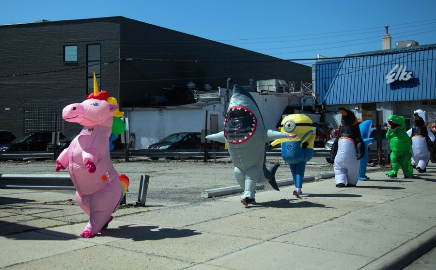 Read moreThe T-Rex Walking Club, a group of people that gathers in a variety of inflatable costumes and parades through neighborhoods in hopes of cheering up the community during the coronavirus lockdown, is photographed in Ferndale, Michigan, on April 27, 2020. #