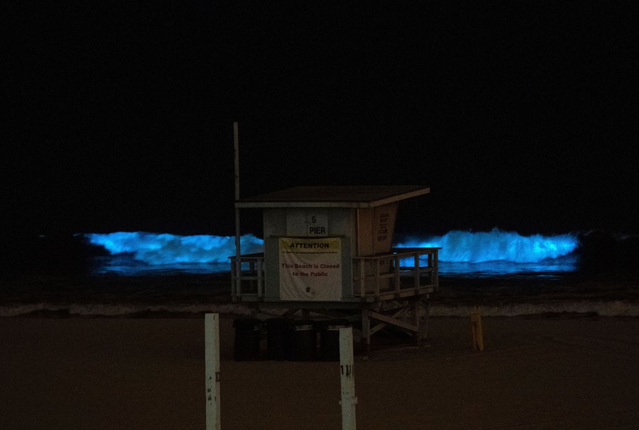 Read moreA lifeguard tower is seen as bioluminescent waves crash on the sand, shining with a blue glow, in Manhattan Beach, California, on April 28, 2020. The bioluminescence is a phenomenon caused by certain kinds of phytoplankton associated with red tide that generate a pulse of blue light as the waves crash. #