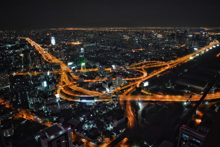 Read moreBangkok, Thailand, as seen from the viewing platform of the Baiyoke Sky Hotel on April 29, 2020, showing illuminated, intersecting highways, empty of vehicles, after the start of a curfew #