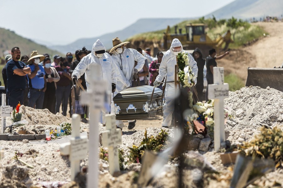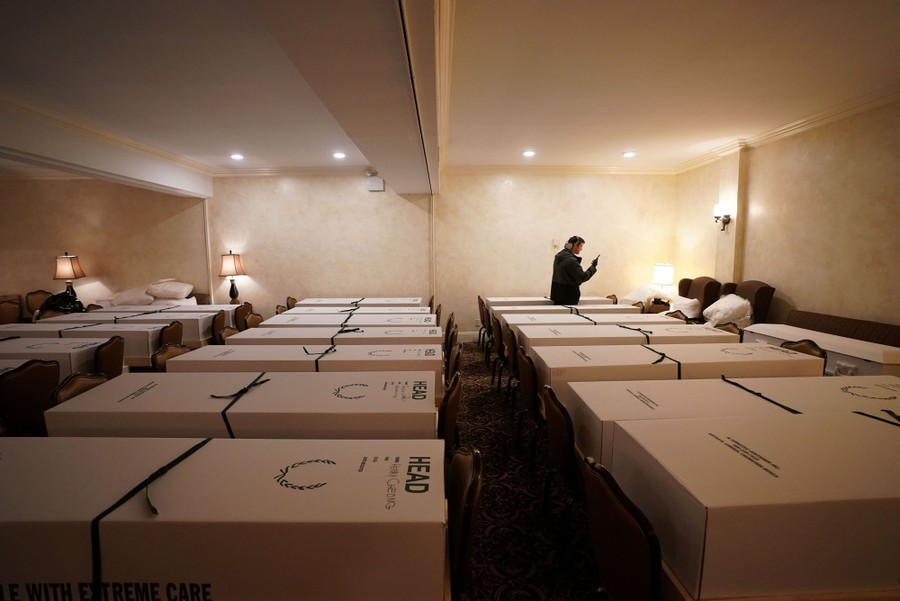 Read moreJoseph Neufeld Jr. looks over caskets of bodies at the Gerard J. Neufeld funeral home during the coronavirus pandemic, in the borough of Queens, New York, on April 26, 2020. #