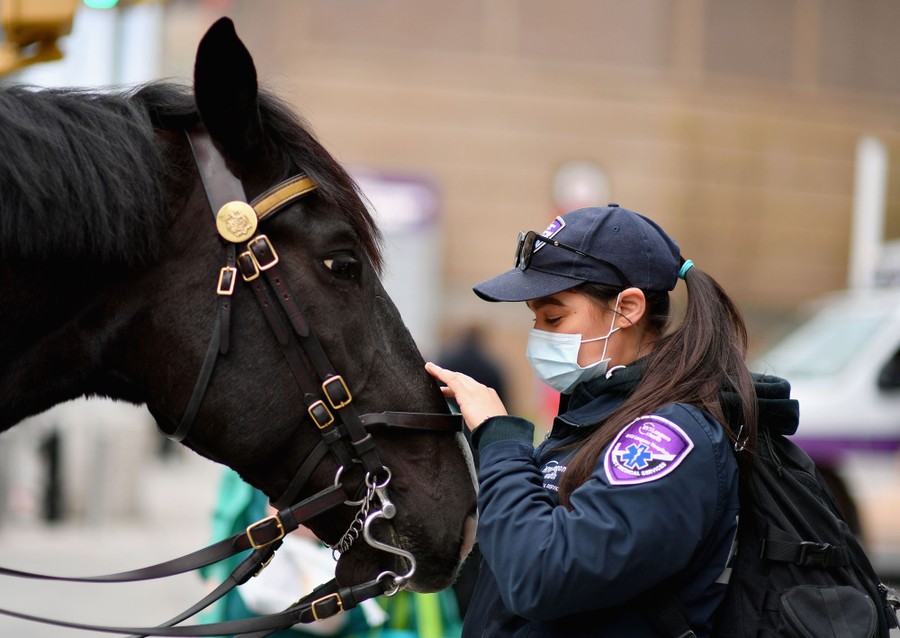 Read moreA health-care worker pets a New York Police Department horse as people cheer and applaud to show their gratitude to medical staff and essential workers outside NYU Langone Health hospital on April 23, 2020, in New York City. #