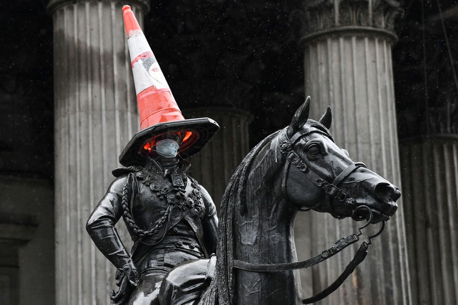Read moreThe Duke of Wellington statue outside the Gallery of Modern Art, which has become well known for having an orange traffic cone placed on its head by students and revelers in the city, is seen sporting a face mask on April 29, 2020, in Glasgow, Scotland. #