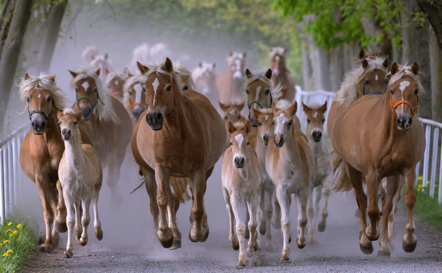 Read moreHaflinger mares with their foals run during this year's first outing, heading toward grassy fields at Europe's largest Haflinger stud farm in Meura, Germany, on April 28, 2020. #