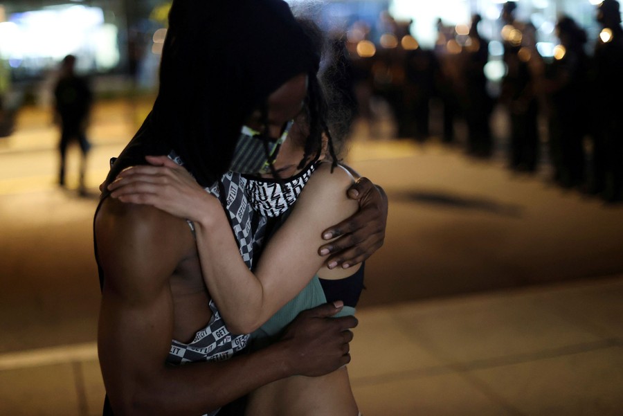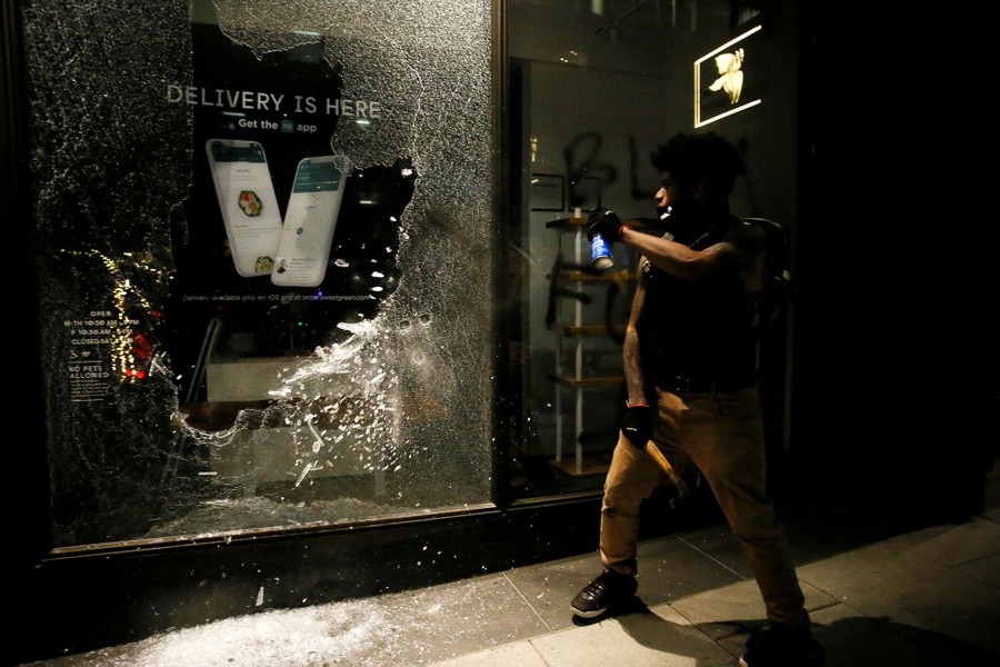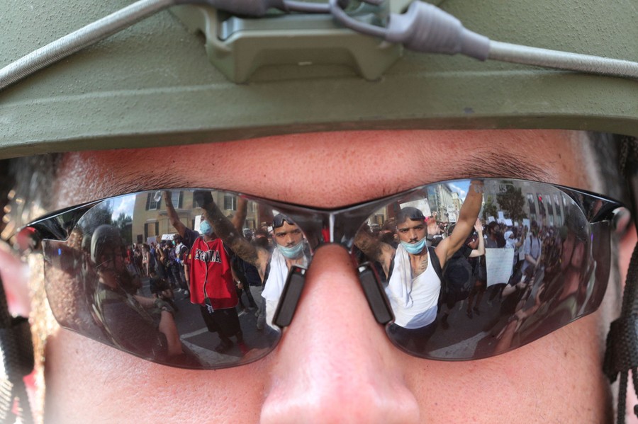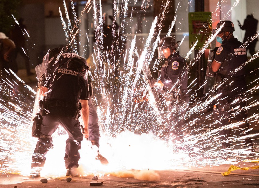 Read moreFireworks thrown by protesters explode among police officers one block from the White House on May 30, 2020, in Washington D.C., during a protest over the killing of George Floyd. #