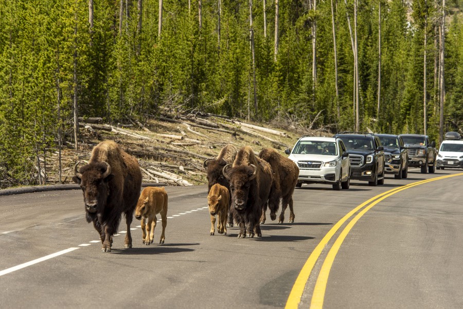 Read moreA group of bison and their calves walk on the road as the Montana gates to Yellowstone National Park opened for day trips on June 1, 2020, in Yellowstone National Park, Wyoming. The park's Montana entrances opened as the state entered the second phase of lifting lockdown measures imposed due to the COVID-19 pandemic. #