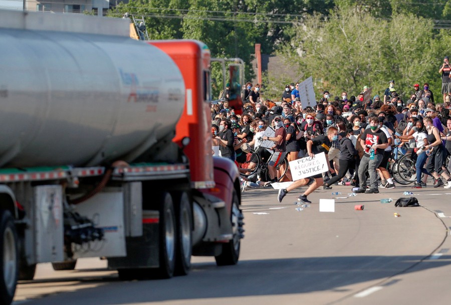 Read moreA tanker truck is driven into thousands of protesters marching on 35W Highway, northbound, in Minneapolis, Minnesota, on May 31, 2020, during a protest against the killing of George Floyd. The truck stopped in time, and no injuries were reported among the frightened marchers. The driver, Bogdan Vechirko, was beaten by some of the crowd, then arrested, but later released without charges—though an investigation continues. #