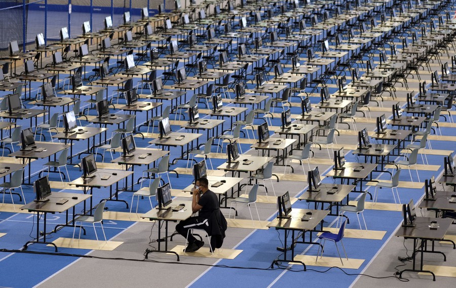 Read moreA student of Louvain-La-Neuve University sits at a desk during an exam organized in the new athletics indoor hall, on June 2, 2020, as Belgium began easing its lockdown measures. Students can choose to take their exams at home, or at a desk in this hall. #