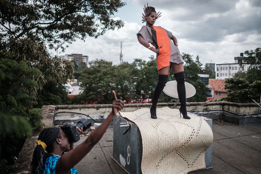 Read moreThe Kenyan photographer and art director Barbara Minishi (left) takes pictures of her roommate and fashion stylist, Wambui Thimba, wearing a creation by a Kenyan fashion designer on the rooftop of their apartment in Nairobi, Kenya, on June 1, 2020. After their scheduled work was canceled due to the coronavirus outbreak, Minishi and Thimba have started their own project, called the "Kenya Fashion & Style Diary in 21 Days," to showcase a Kenyan fashion brand every day for three weeks on social networking services, since May 22, with photoshoots at their apartment only. #