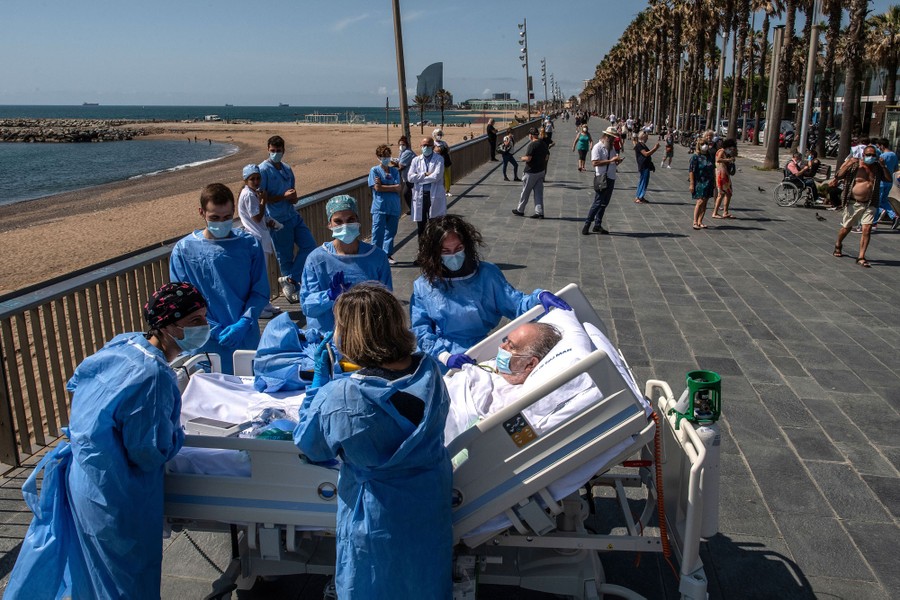 Read moreIsidre Correa, a hospital patient, is taken to the seaside by intensive health-care staff outside the Hospital del Mar in Barcelona, Spain, on June 3, 2020. Correa was taken into the ICU on April 14 after his coronavirus infection worsened while he had been in the hospital since April 9. On June 3, he left the ICU to continue his recovery at the hospital. Hospital del Mar has been taking COVID-19 patients from the ICU to the seaside as part of their recovery process, aiming to humanize its ICUs. #
