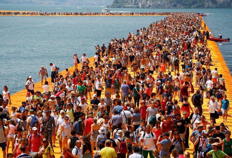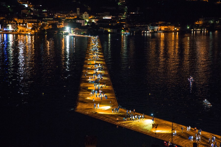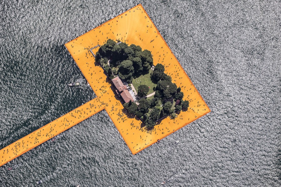 Read moreAn aerial view of the installation "The Floating Piers," by Christo. The work connects the village of Sulzano, Italy, to the small island of Monte Isola and another very small island (São Paulo Island) on June 28, 2016. #