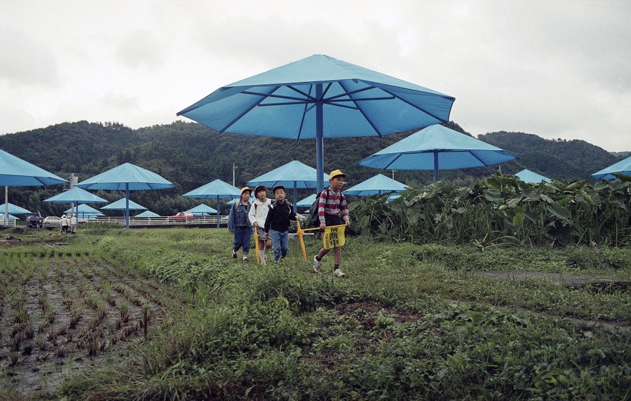 Read moreLocal public school children make their way down a footpath through rice fields and blue umbrellas in Sato River Valley, north of Tokyo, on October 9, 1991. After a one-day delay due to heavy rain, hundreds of workers opened 1,340 umbrellas, a work titled "The Umbrellas," spread throughout this farming valley. #