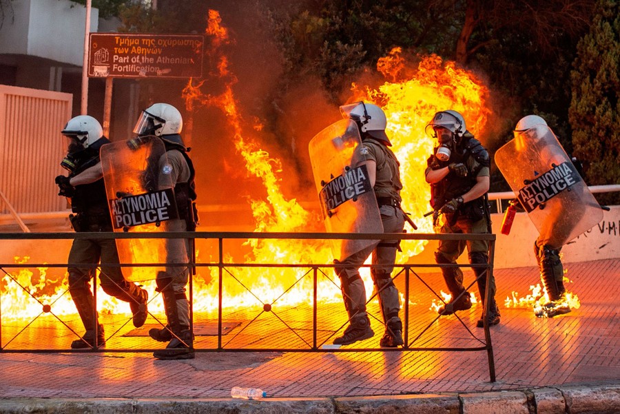 Read moreRiot police officers try to avoid petrol bombs thrown by protesters outside the Greek Parliament during a demonstration against a new law on protest rules in Athens, Greece, on July 9, 2020. #