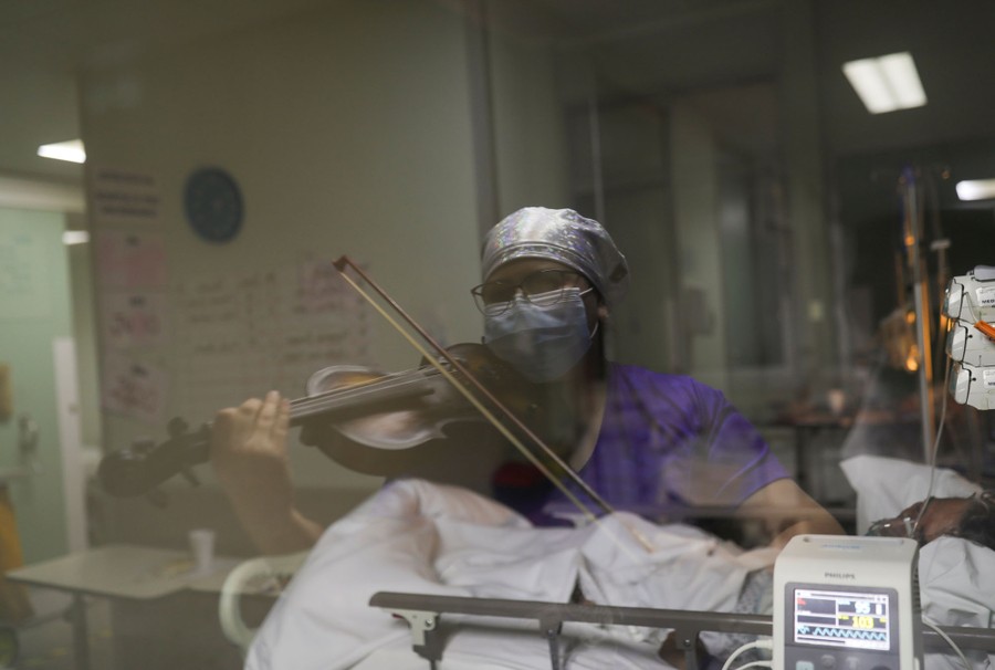 Read moreThe Chilean nurse Damaris Silva plays the violin for patients suffering from COVID-19 in the Intensive Care Unit of El Pino de San Bernardo Hospital in Santiago, Chile, on July 2, 2020. #