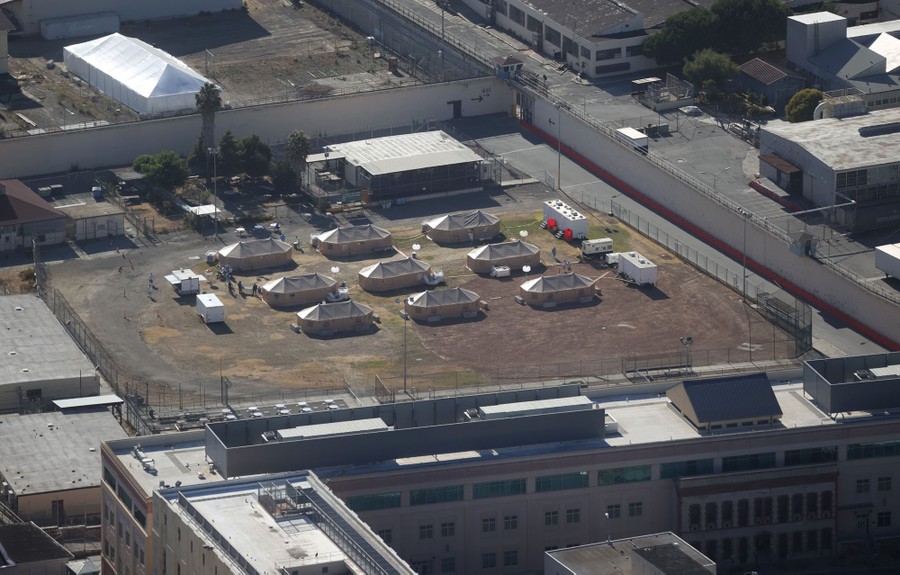 Read moreA view of a new emergency care facility that was erected to treat inmates infected with COVID-19 at San Quentin State Prison on July 8, 2020, in San Quentin, California. Over 1,400 inmates and staff at San Quentin State Prison have become infected with the new coronavirus. #