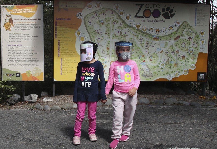 Read moreGirls wearing face shields as a preventive measure against the new coronavirus wait for their parents to enter the zoo on the outskirts of Quito, Ecuador, on July 8, 2020. The zoo is reopening but with strict new social distancing protocols for visitors, due to the COVID-19 pandemic. #