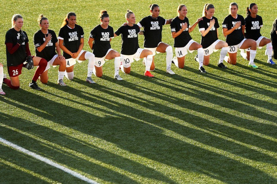 Read moreMembers of the OL Reign kneel for the national anthem before the quarterfinal match of the National Women's Soccer League Challenge Cup at Zions Bank Stadium on July 18, 2020, in Herriman, Utah. #