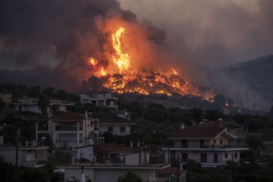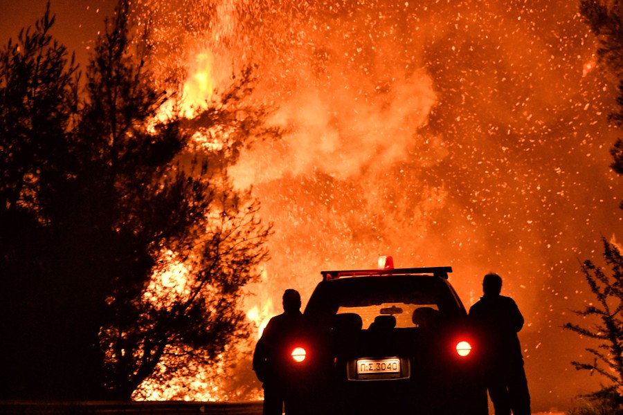 Read moreFirefighters stand near a pine forest wildfire fanned by strong winds near the village of Athikia, near Corinth, Greece, late on July 22, 2020. Greek authorities evacuated five settlements as a precaution. #