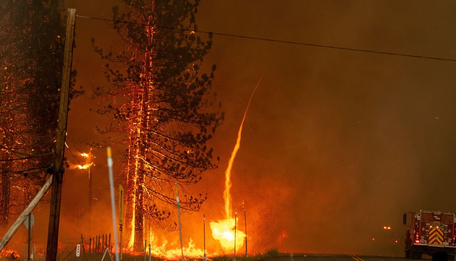 Read moreA fire whirl shoots into the sky as flames from the Hog Fire jump over Highway 36, about five miles from Susanville, California, on July 20, 2020. The fire exploded quickly to more than 6,000 acres and created its own weather, generating lightning, thunder, rain, hail, and fire whirls out of a huge pyrocumulonimbus ash plume towering above. The Lassen County Sheriff's office issued a mandatory evacuation order for the area. #