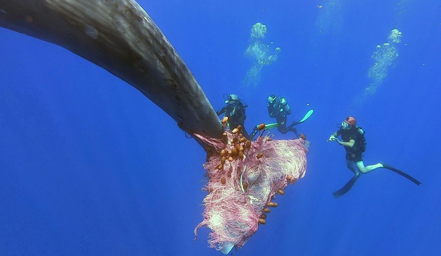 Read moreItalian Coast Guard divers work to free a sperm whale caught in a fishing net north of the Sicilian Aeolian Islands in this still image taken from a video, on July 19, 2020. #