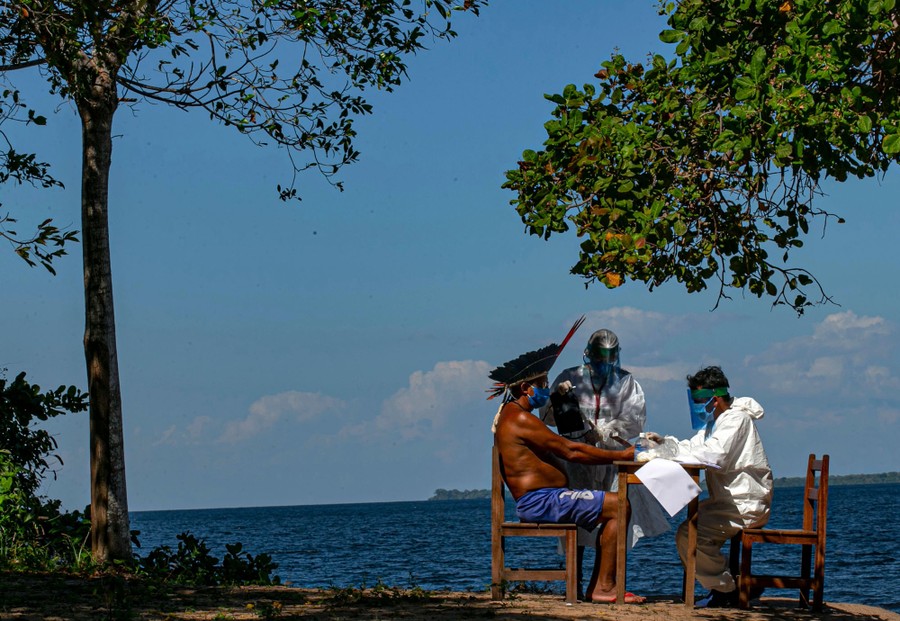 Read moreIndigenous nurses from the Special Secretariat for Indigenous Health of the Arapiuns and Tapuia ethnic groups perform a rapid COVID-19 test on Chief Domingos from the Arapium tribe on the banks of the lower Tapajos River in western Para, Brazil, on July 19, 2020. #