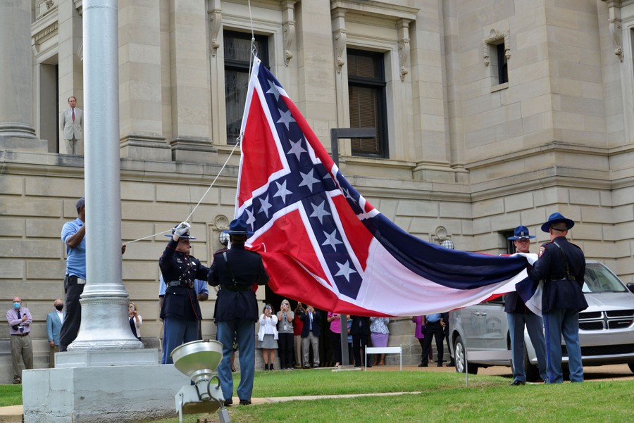 Read moreMembers of the Mississippi Honor Guard lower the state flag at the state capitol in Jackson, Mississippi, on July 1, 2020, a day after a bill that would replace the state flag, which includes a Confederate emblem, was signed into law. #